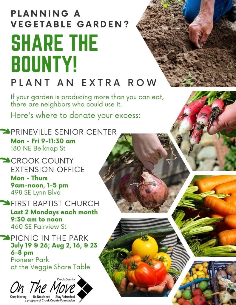 Nourish families and prevent food waste – If you have excess produce, join the “Share The Bounty” effort by sharing that excess to help those that are food insecure.