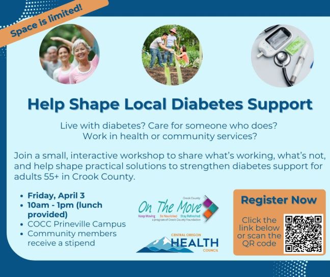 Join us in a small, interactive workshop to help strengthen diabetes support for adults 55+ in Crook County. Your input will directly guide local action.