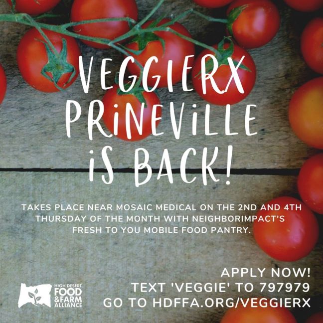 Here’s where to donate your extra garden produce in Prineville!Tuesdays and Thursdays: 11am to 2pmWednesdays: 1pm to 3pmSt. Vincent de Paul1103 NE Elm Street(Deliveries in alley between St. Vincent and Police Station.)Monday through Friday: 9am to noonCraig’s Compassionate Café780 E. First StreetLast 2 Mondays of each month: 9:30 – 10:00 amFirst Baptist Church Food Pantry460 … Continue reading Help Nourish Families