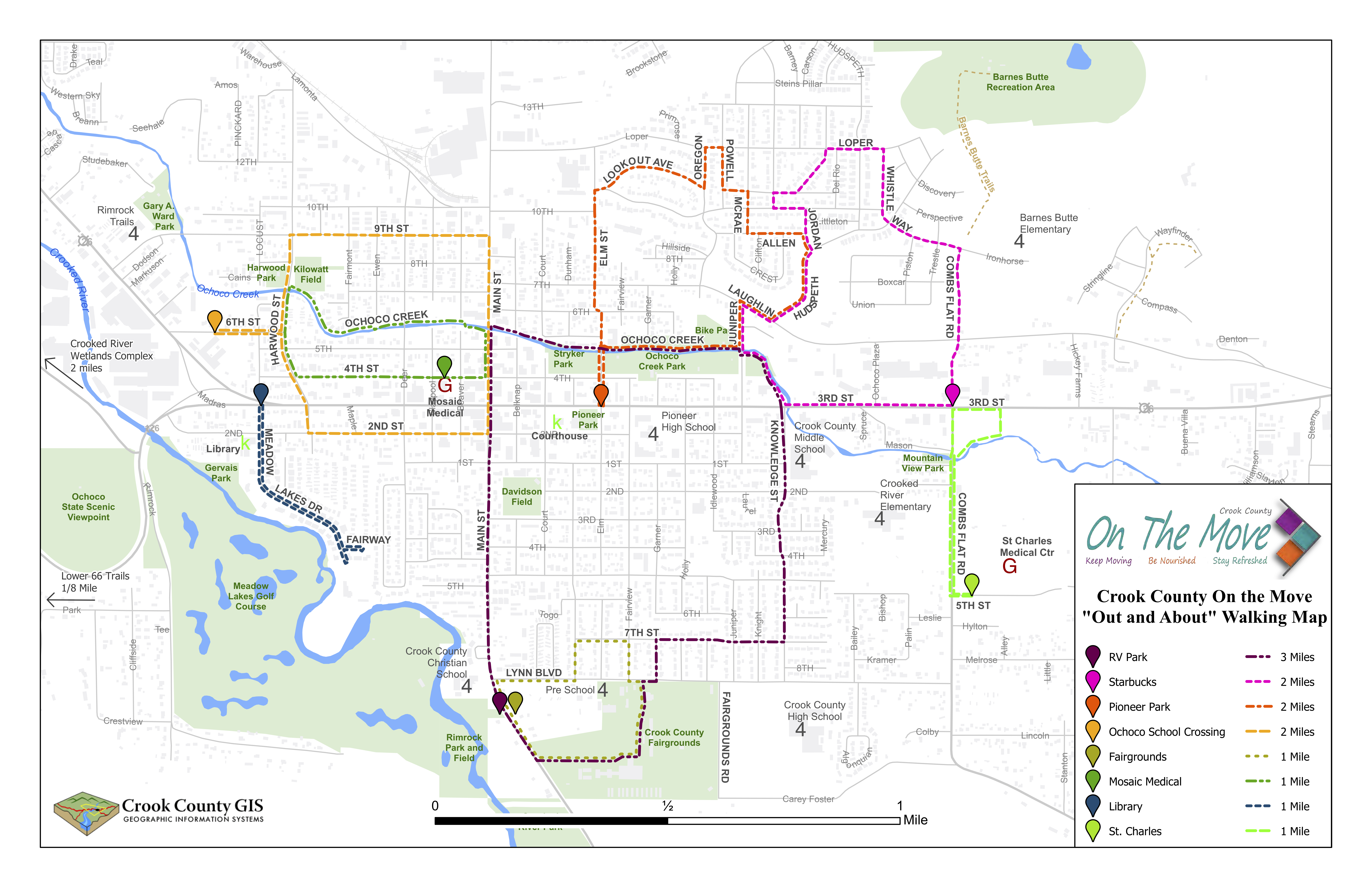A collaborative effort between Crook County On The Move, Rotary Club of Crook County and our Parks and Recreation District. Benches were made possible with generous donations from AARP, Rotary Club, St. Charles Health Systems, Pacific Source, Central Oregon Health Council and Crook County Foundation, through its Crook County On The Move program, and Ochoco Lumber Company. Labor was provided by Heart of Oregon, Crook County Parks and Recreation,Pacific Source and Rotary Club of Crook County.
