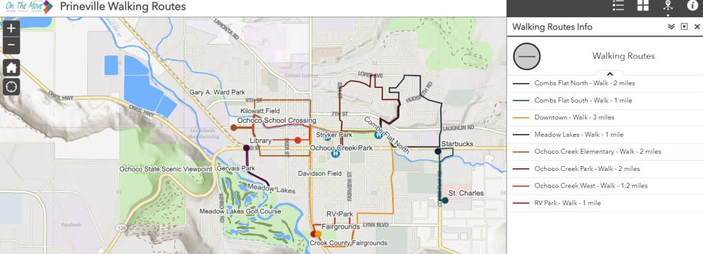 In Prineville, we have a beautiful path starting just north of the intersection of Knowledge and Third Street. The Ochoco Creek Trail meanders along Ochoco Creek so we can enjoy the babbling creek, the singing birds and the beautiful Central Oregon sunshine. The trail extends all the way to Harwood Street, allowing us to increase our walking distance with minimal interference from motorized traffic. The Juniper Street Covered Area now has a paved pathway from the parking lot to the trail, making it fully accessible for everyone and a great starting point!